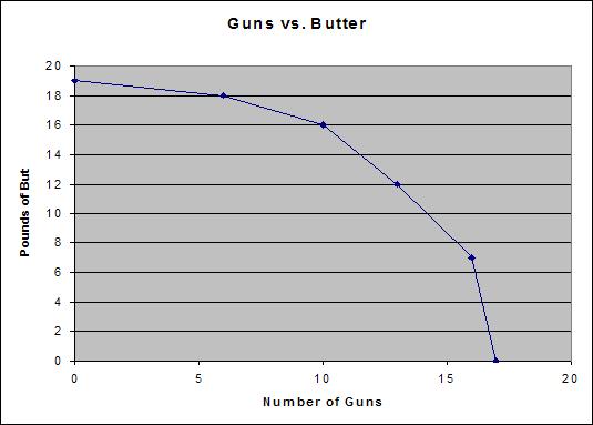 Production Possibilities CurveA Production Possibilities Curve measures the maximum combination of outputs that can be obtained from a given number of inputs. It conveys the same information as the Production Possibilities Table but in graphical format. Below is the Production Possibilities Curve for the "Rice vs. Iron Ore" example. Notice that the graph is linear which reflects the constant Opportunity Costs. Next is the Production Possibilities Curve for the "Guns vs. Butter" example. Notice that the Curve is bowed outward. This reflects the Principle of Increasing Marginal Opportunity Costs we discussed in the previous section. Back to Production Possibilities Model |